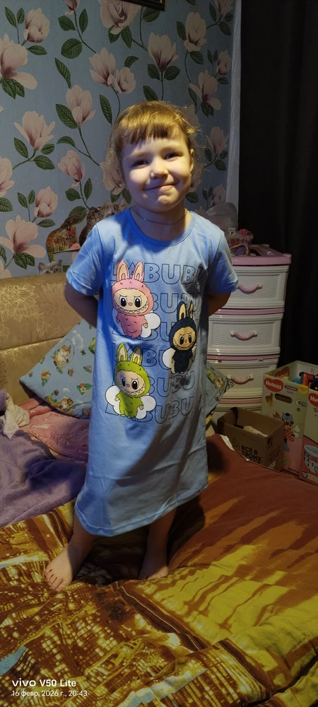 Яркий принт с Лабубу придаёт изделию индивидуальность, а стойкий рисунок сохраняет насыщенные краски даже после многократных стирок. Это платье-сорочка станет любимой вещью для девочки: в ней удобно спать, играть и проводить время дома.